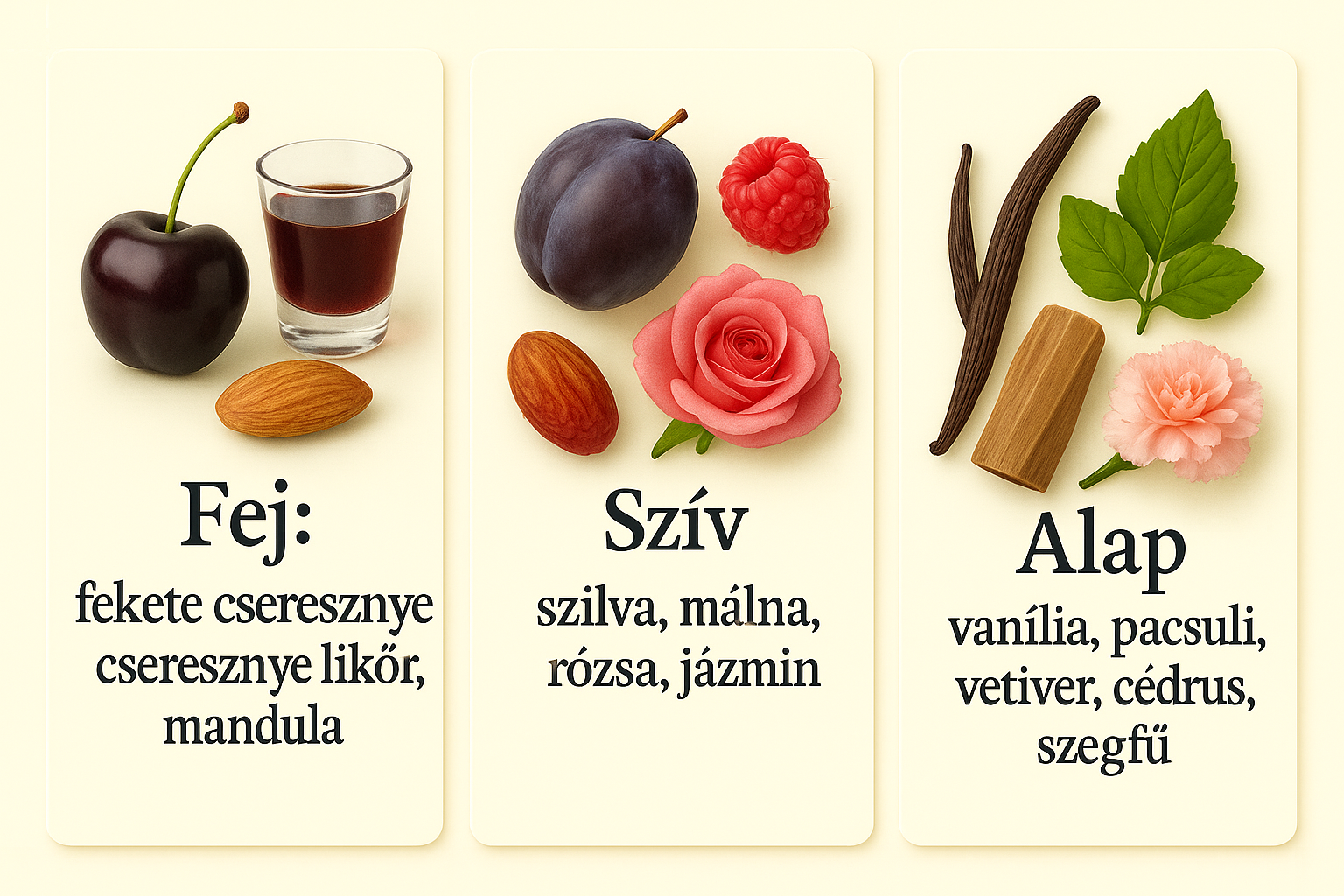 Fej: fekete cseresznye, savanykás cseresznye, cseresznye likőr, mandula
