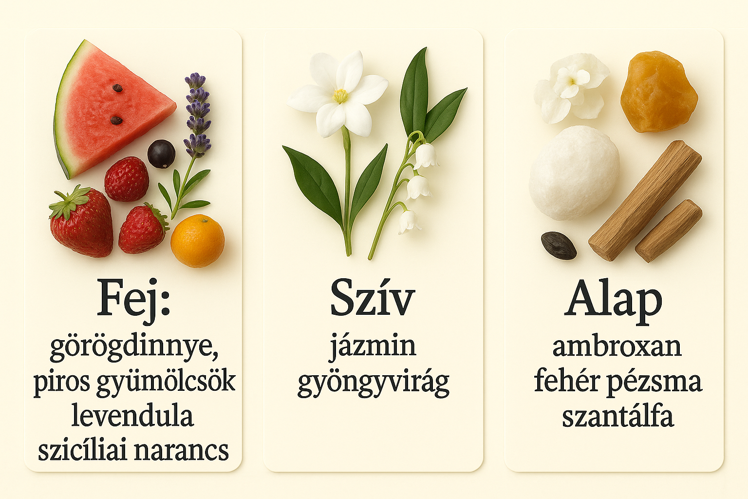 Fej: görögdinnye, piros gyümölcsök, levendula, szicíliai narancs