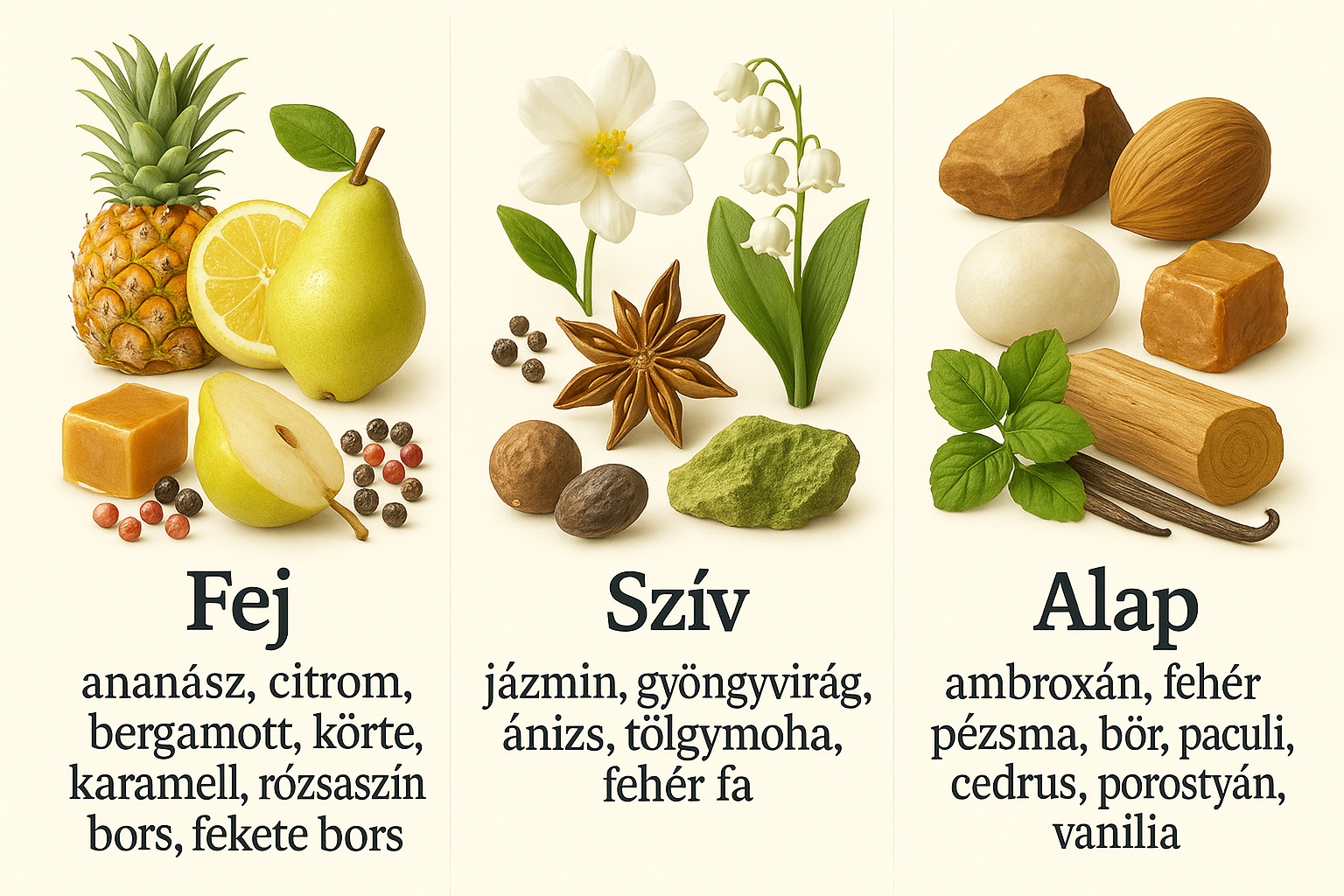 Fej Fej: ananász, citrom, bergamot, körte, karamell, rózsaszín bors, fekete bors