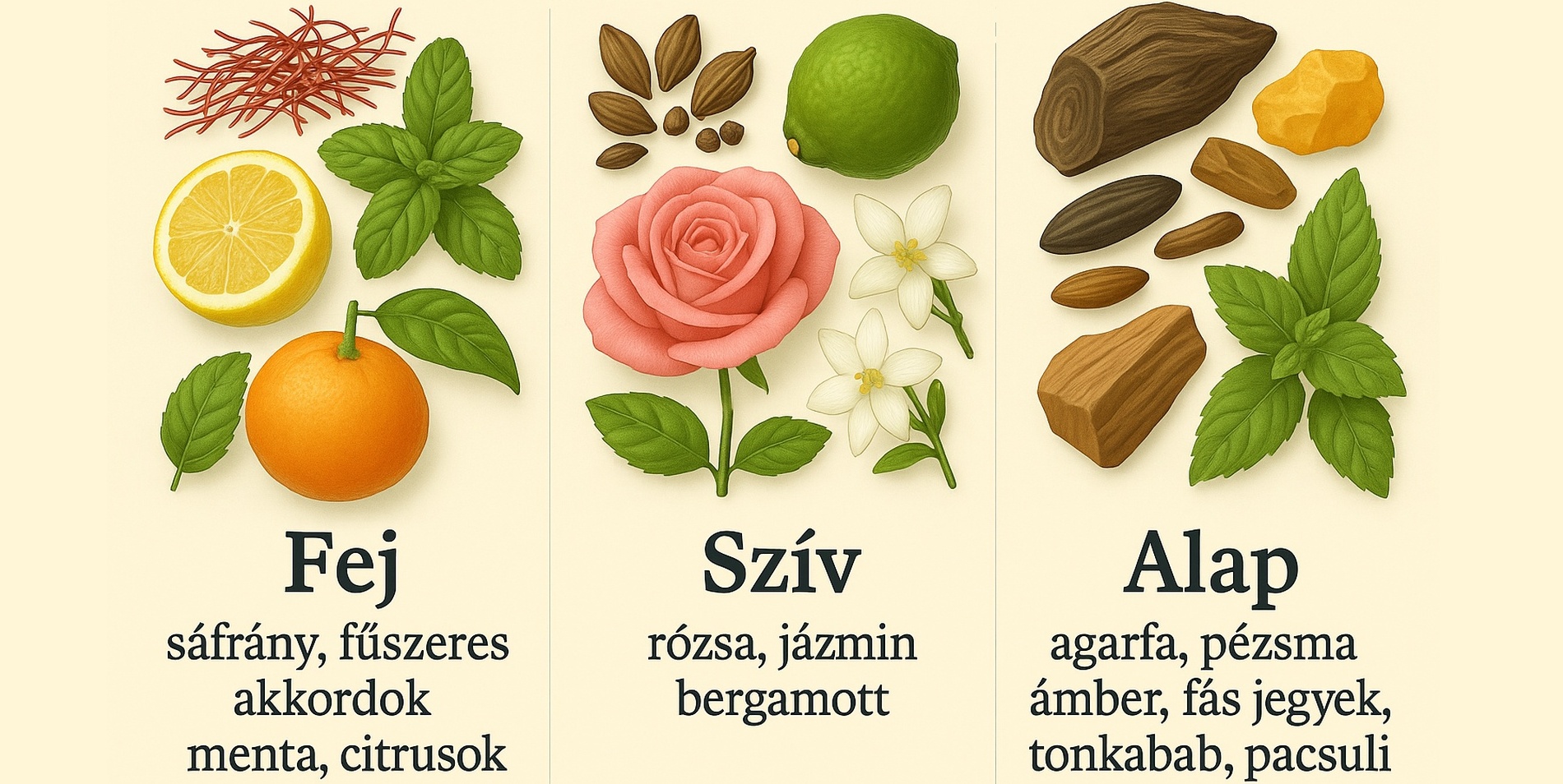 Fej: sáfrány, fűszeres akkordok, gyümölcsök, zöld jegyek, menta, citrusok