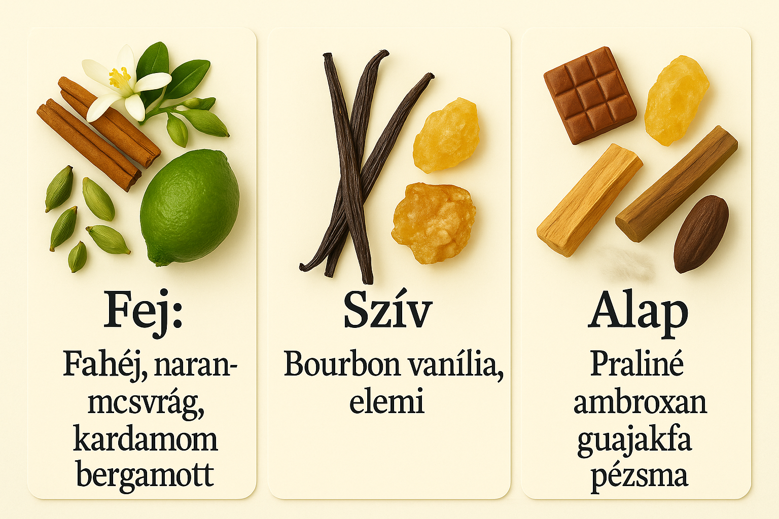 Fej: Fahéj, narancsvirág, kardamom, bergamott