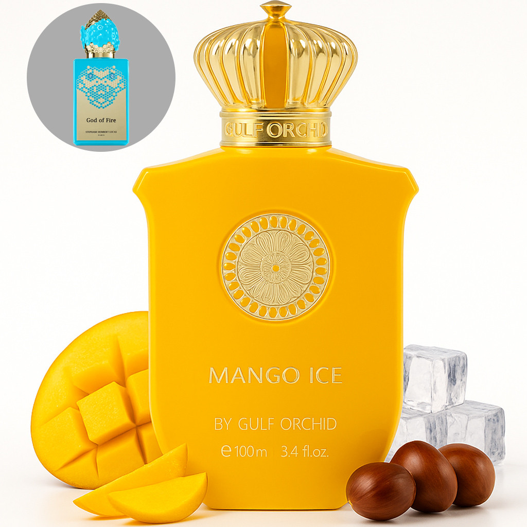 Gulf Orchid „Mango Ice” egy energikus, uniszex illat, amely egyszerre idézi a trópusi meleg és a jeges frissesség kontrasztját. Az illat elején az érett mangó édessége találkozik a gyömbér élénkségével és a rebarbara enyhe savanykásságával. Később finom fehér virágok és ámbra érintik az illatot, amelyek lágyítják az intenzív gyümölcsösséget. A bőrön az illat kifinomult, meleg alapba olvad, ahol a pézsmás tónus, vanília, karamell és gesztenye egészítik ki a kompozíciót. Összességében könnyed, mégis karakteres illat, kiváló választás melegebb napokra, ha valaki a gyümölcsös, krémes árnyalatokat kedveli.