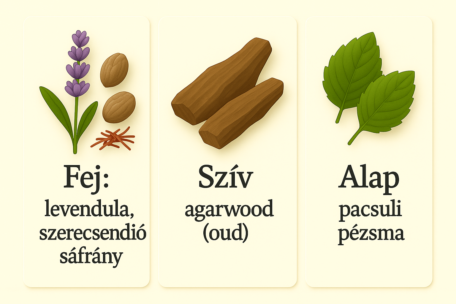 Az illat egyedülállóan mély és gazdag, a nyitó jegyekben fellelhető levendula és szerecsendió frissessége elegánsan fonódik össze a szívjegyben található oud fával, amely melegséget és intenzitást kölcsönöz az illatnak. A pačuli és pézsma alapjegyek megalapozzák az illat tartósságát és erőteljességét, amely egész nap kísérni fogja viselőjét.
