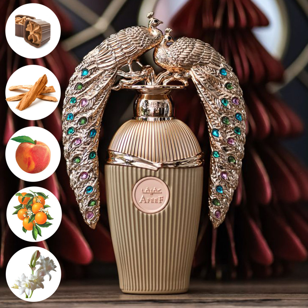 A Lattafa Afeef egy modern uniszex parfüm, amely friss gyümölcsösséggel és virágos eleganciával indít. A barack lédús édessége és a rózsabors fűszeres karaktere különleges nyitányt ad az illatnak. A szívjegyekben a jázmin, az ibolya, a narancsvirág és a tubarózsa lágyan bontakoznak ki, nőies és kifinomult hangulatot teremtve. Az alapban a praliné édes gourmand vonala keveredik a szantálfa krémes melegségével. Az ámbra és a pézsma mélységet és hosszan tartó eleganciát kölcsönöznek a kompozíciónak. Ez az illat egyszerre játékos, érzéki és elegáns.