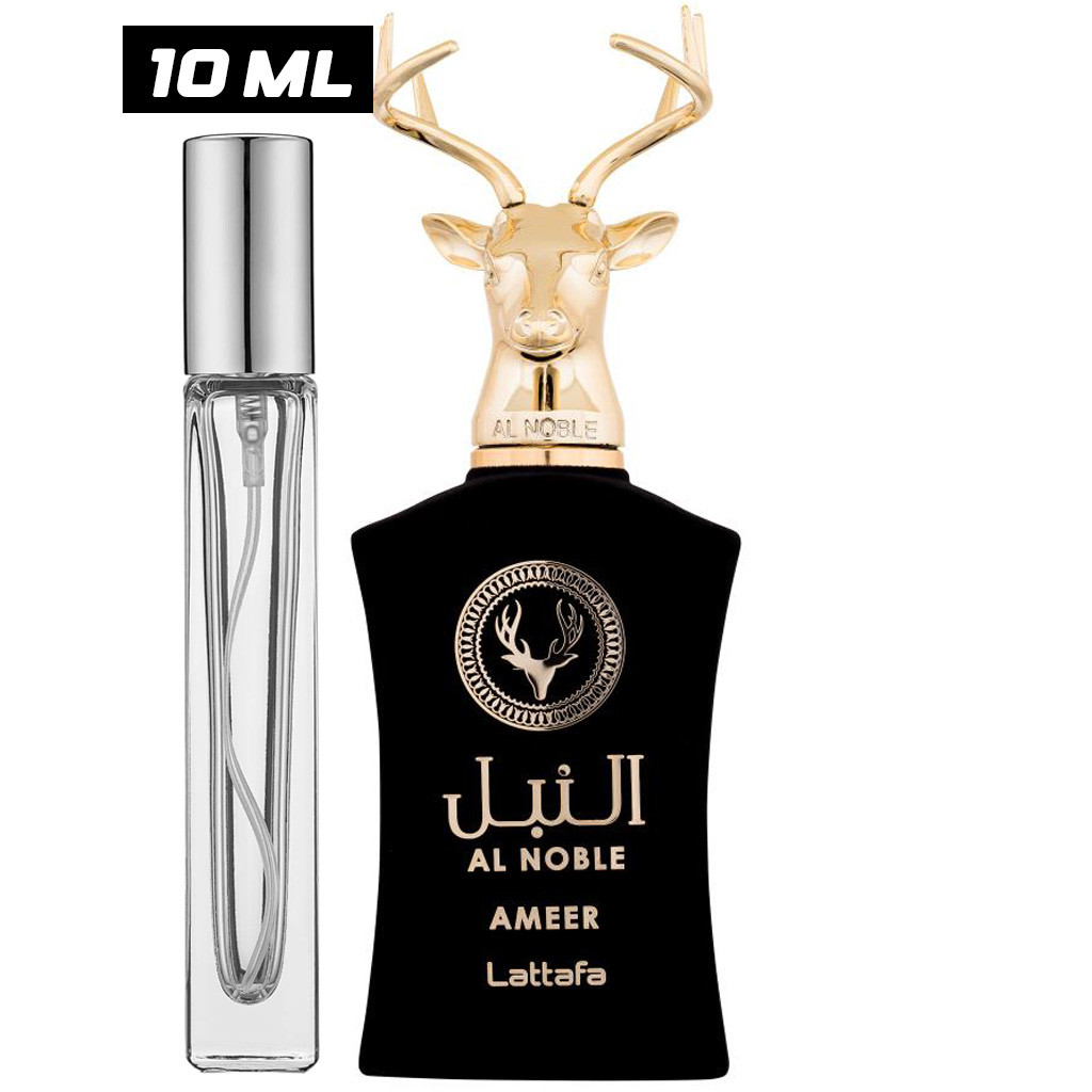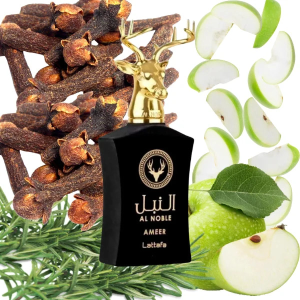 A Lattafa Al Noble Ameer egy uniszex parfüm, amely az orientális és fás illatcsaládba tartozik. Az illatkompozíció friss, gyümölcsös és fűszeres jegyekkel nyit, amelyek az alma, a rózsabors és a rozmaring kombinációjából állnak. A szívjegyben a szegfűszeg és virágos akkordok melegséget és mélységet kölcsönöznek az illatnak. Az alapjegyekben az oud, a pacsuli, a ciprus, a labdanum és a vetiver fás és füstös alapot biztosítanak, amelyek hosszan tartó hatást nyújtanak. Ez a parfüm ideális esti viselethez vagy különleges alkalmakra, kifejezetten a hűvösebb hónapokban. Az illat összetettsége és mélysége miatt különösen vonzó azok számára, akik kedvelik a gazdag és kifinomult aromákat.