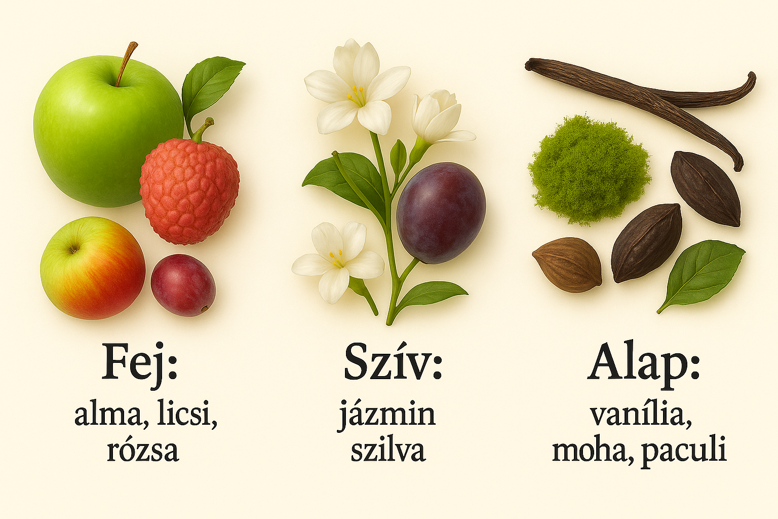 Az illat nyitánya az édes alma, az egzotikus licsi és a romantikus rózsa jegyeivel indul, melyek friss és virágos hangulatot teremtenek. A szívjegyekben a jázmin és az érett szilva dominálnak, mélységet és gazdagságot kölcsönözve az illatnak. Az alapjegyekben a vanília, a moha és a pacsuli egyesülnek, melegséget és érzékiséget adva a kompozíciónak. Ez a parfüm ideális választás mindennapi viseletre, különösen a hidegebb napokon és esti alkalmakra, hosszan tartó hatásával és különleges illatával.