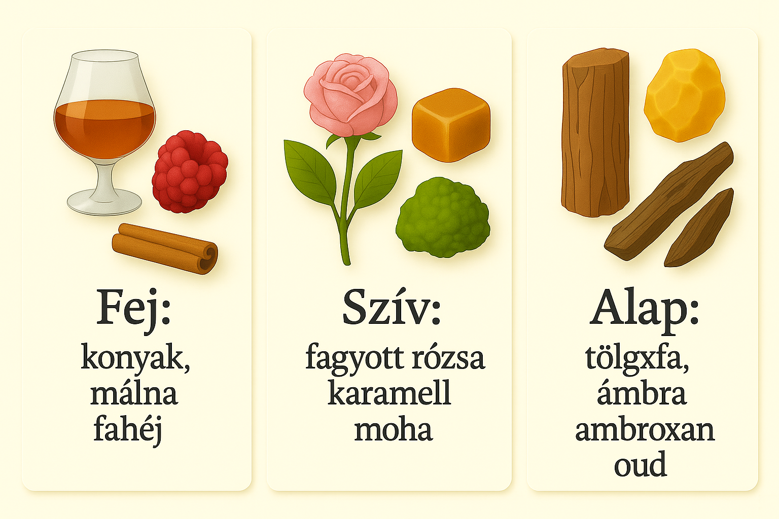 Alap: tölgyfa, mirha, cédrusfa, ambroxan
