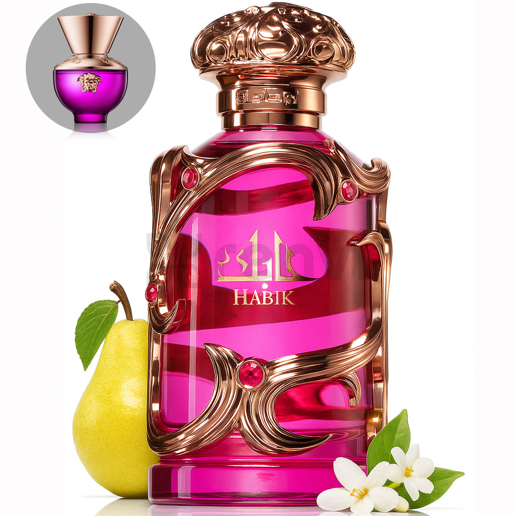 A Lattafa Habik for Women egy ragyogóan friss, virágos-gyümölcsös illat, amely az első fújástól könnyed, modern eleganciát sugároz. A nyitányban a lédús körte és a pezsgő bergamott adnak tiszta, derűs lendületet. A szívben fehér virágcsokor bontakozik ki: gyöngyvirág, jázmin és frézia finom, légies nőiességet rajzolnak. Az alapban a pézsma meleg ölelése, a borostyán aranyló fénye és a tölgymoha bársonyos, kissé földes árnyalata simítja egységbe a kompozíciót. Könnyen viselhető nappalra, mégis elegánsan tartós az esti programokhoz is.
