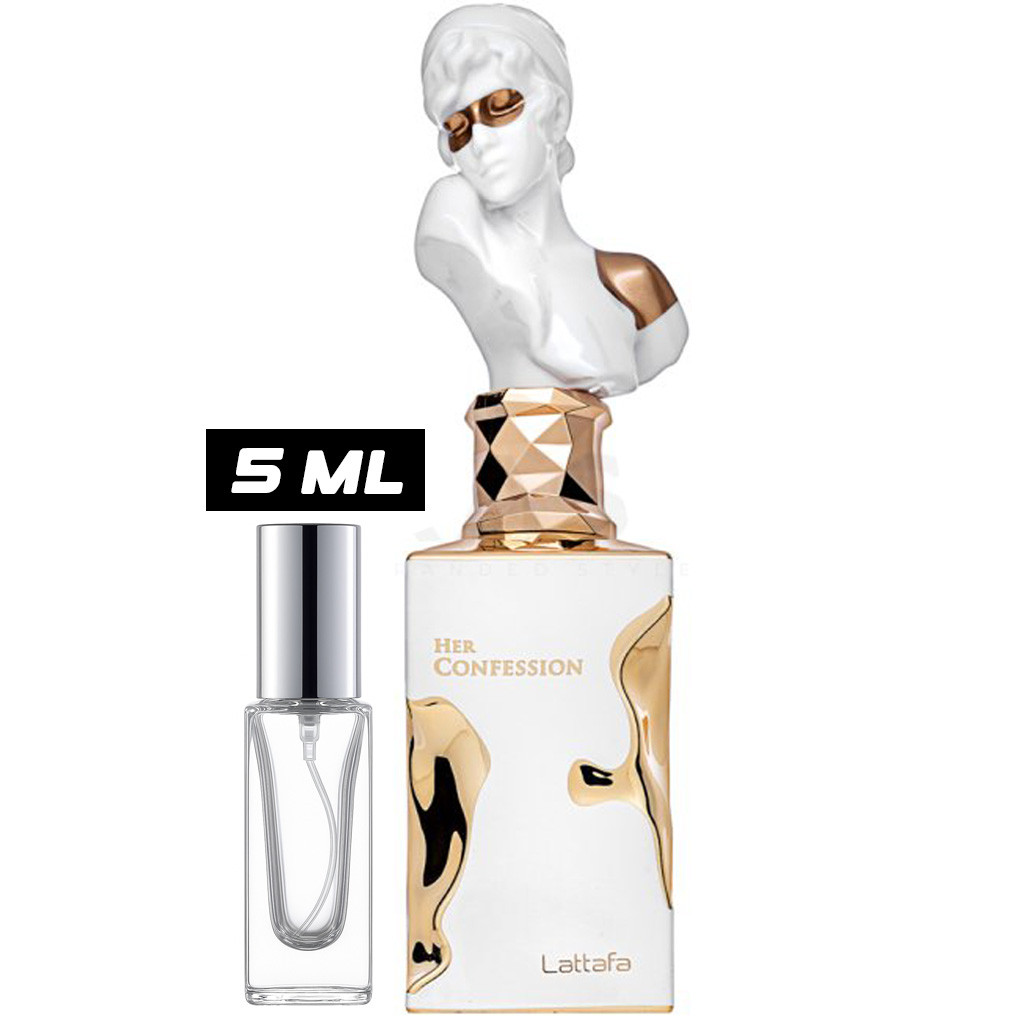 A Lattafa Her Confession egy 2024-ben bemutatott orientális-virágos női parfüm, amely a melegség, a titokzatosság és az elegancia harmonikus egyensúlyát kínálja. Az illat nyitánya a fahéj és a misztikus akkordok fűszeres keverékével indul, amely azonnal felkelti az érzékeket. A szívjegyekben a jázmin és a tubarózsa virágos gazdagsága bontakozik ki, melyeket a tömjén füstös árnyalatai és a mahonial növény finom illata egészít ki. Az alapjegyekben a tonkabab, a pézsma és a vanília édes és hosszan tartó lecsengést biztosítanak, melegséget és érzékiséget kölcsönözve az illatnak. Ez a parfüm ideális választás azoknak a modern nőknek, akik magabiztosságot, bájt és egy csipetnyi rejtélyt szeretnének sugározni.