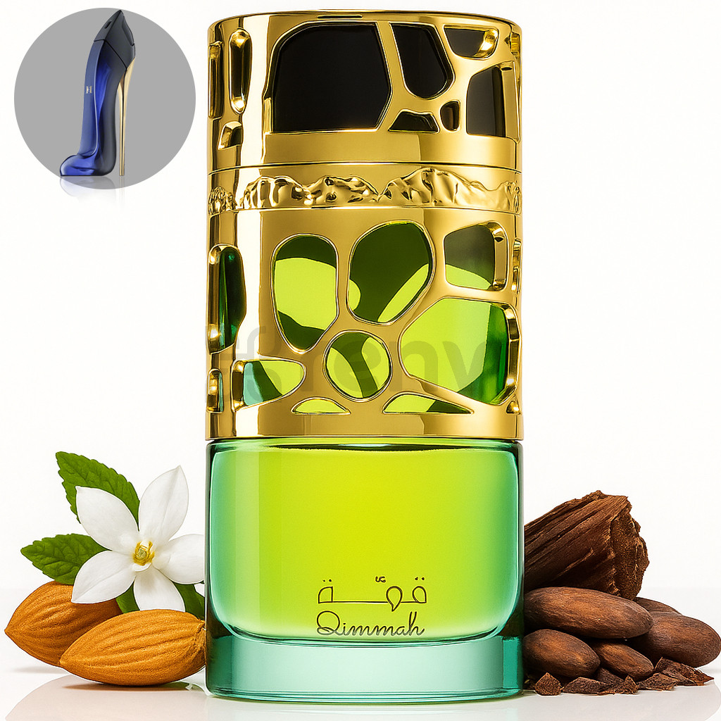 A Lattafa Qimmah for Women egy modern, gourmand–fehér virágos kompozíció 2022-ből, amely azonnal nőies, magabiztos aurát ad. A nyitányban pörkölt mandula és kesernyés kávé olvad össze, krémes, édes-fűszeres hangulatot teremtve. A szívben tubarózsa és jázmin bontakozik ki, amelyet puha tonkabab kerekít és lágyít. Az alapban vaníliás–kakaós melegség simul tiszta szantálfára, hosszan tartó, bársonyos lecsengéssel. Sokoldalú illat: nappal elegáns, estére csábítóan mély. Ősztől tavaszig különösen erős, de hűvös nyári estére is remek választás.