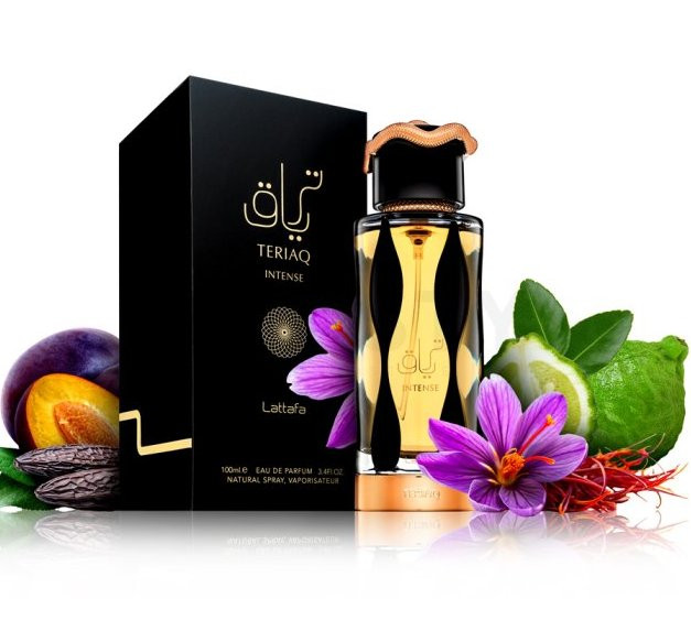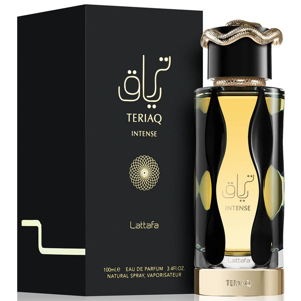 Lattafa Teriaq Intense modern, intenzív aromával rendelkezik, amely keveri a fűszerességet, gyümölcsös lágyságot és egy mély, boros-vaníliás alapillatot. Az illat nyitása friss bergamottra és az aranyos, fűszeres sáfrányra épül, ami eleganciát és keleties vibrálást ad. A szívjegyben a pálinkaszerű szilvalikőr érzete keveredik a fahéj karakteres melegségével, amely fokozza az illat karakterét. Az alapillatban a tonkabab krémes, enyhén diós jellege húzódik meg az ámberszerű melegség és a benzoin finom édes-gyantas tónusaival. Ez az illat kifinomult, fűszeres-gyümölcsös elegy, ami hidegebb időben, estéken igazán érvényesül.