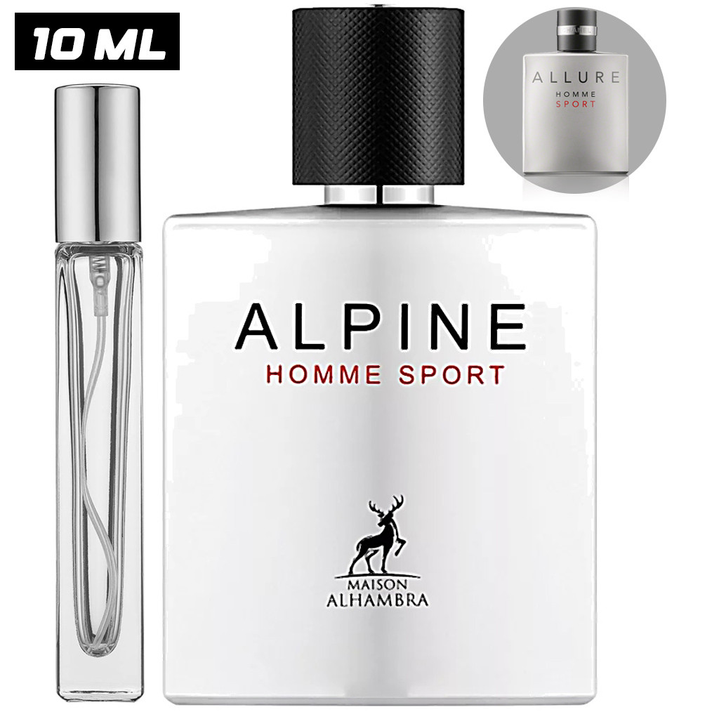 A Maison Alhambra Alpine Homme Sport egy aromás-fás illat férfiaknak. Az illatot a Chanel Allure Homme Sport inspirálta. A parfüm nyitánya friss és élénk, a mandarin, menta, ciprus és zsálya jegyeivel. A szívjegyekben a cédrus és a fekete bors fűszeres, fás karaktert kölcsönöznek az illatnak. Az alapjegyekben a tonkabab, pézsma és szantálfa melegséget és mélységet adnak a kompozíciónak.