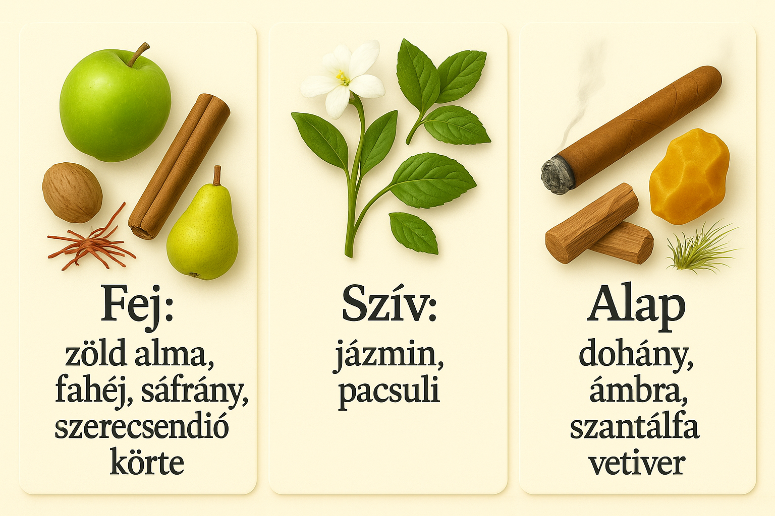 Fej: Zöld alma, fahéj, sáfrány, szerecsendió, gyömbér