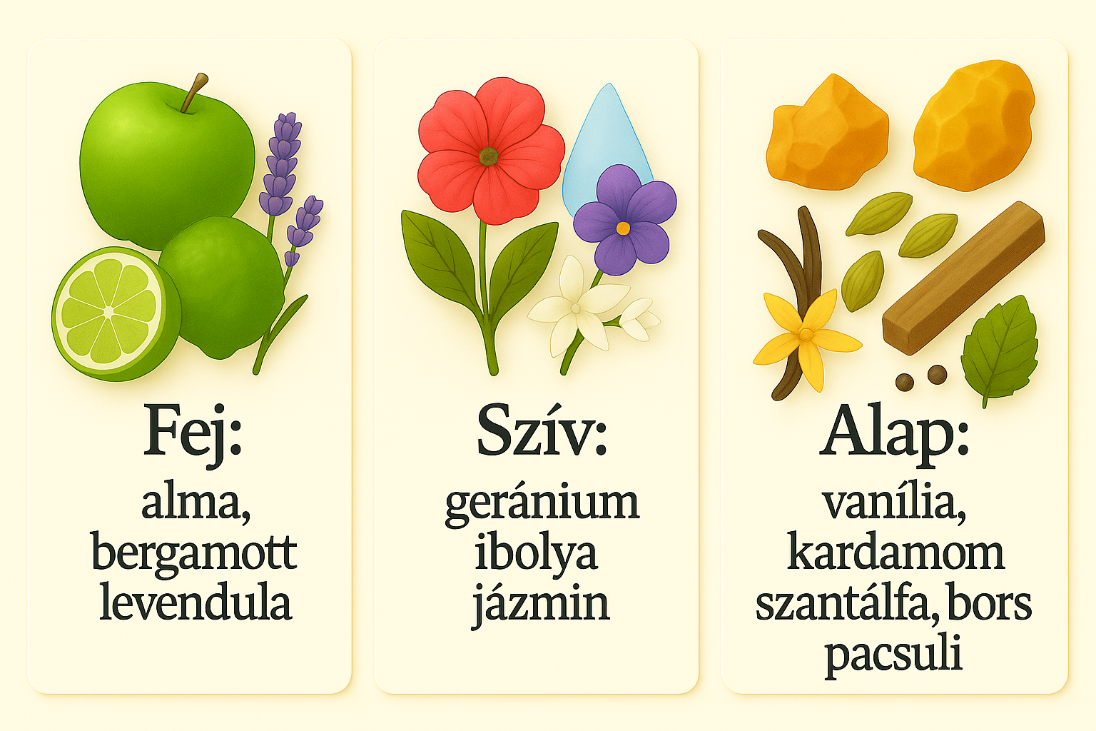 Alap: vanília, kardamom, szantálfa, bors, pacsuli, guajakfa