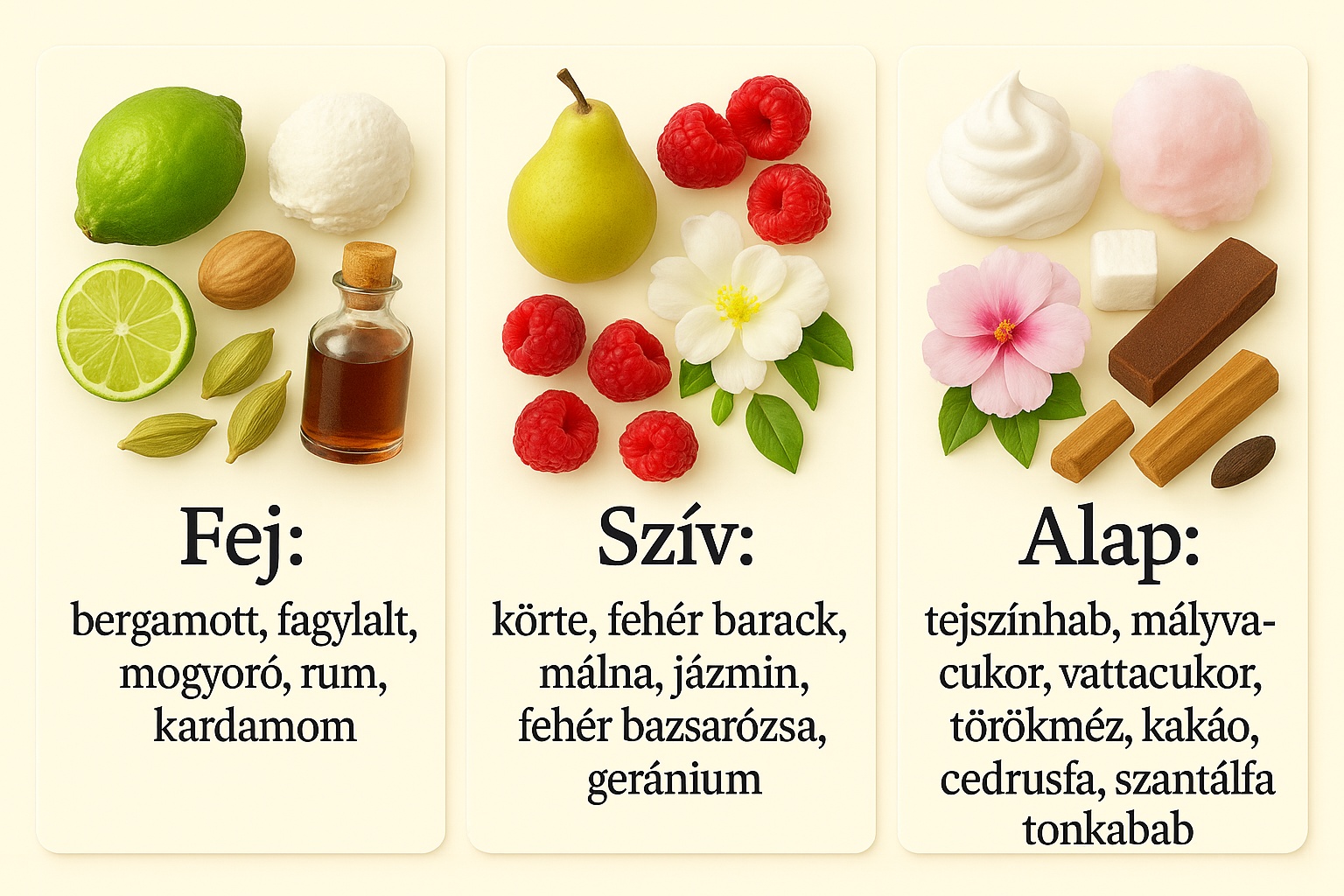 Szív: körte, fehér barack, málna, jázmin, fehér bazsarózsa, geránium