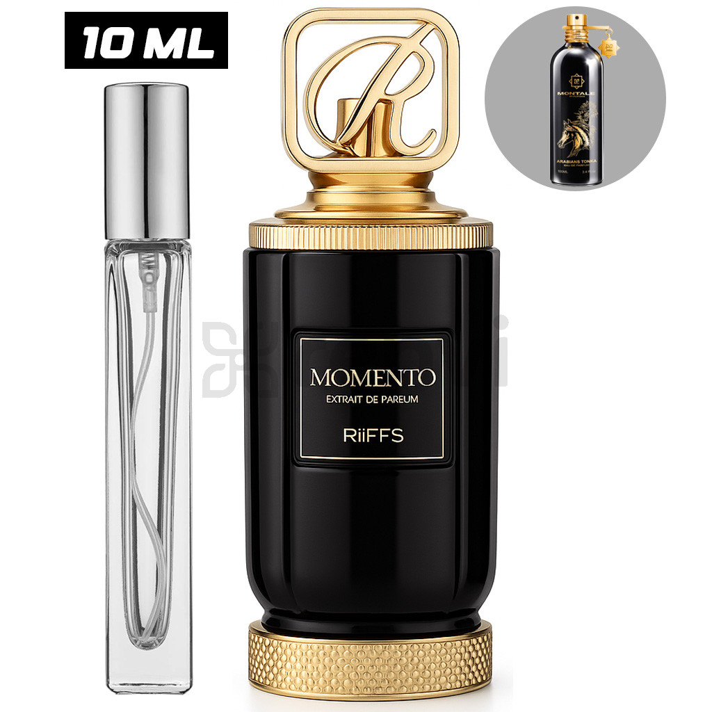 A RiiFFS Momento egy fűszeresen gourmand, uniszex illat, amely az első fújásban a cukor játékos édességét és a sáfrány meleg fényeit villantja fel, mandarin frissességével. A szívben a tonkabab krémes, mandulás tónusai összesimulnak a damaszkuszi rózsa bársonyosságával és az agarfa (oud) sötétebb mélységével, elegánsan hullámzó kontrasztot adva. A kompozíció lassan egyre puhább, balzsamikus karaktert ölt, miközben a borostyánfa és a karamell olvadós melege körbefogja a fás jegyeket. A cédrus száraz erezete rendet tart az édesség fölött, így a végeredmény kifinomult és hosszan tartó, nem tolakodóan cukros. Hidegebb napokra különösen karakteres, de esti alkalmakra egész évben elegáns választás. A 2025-ös megjelenés kortárs, mégis időtálló stílust hoz.